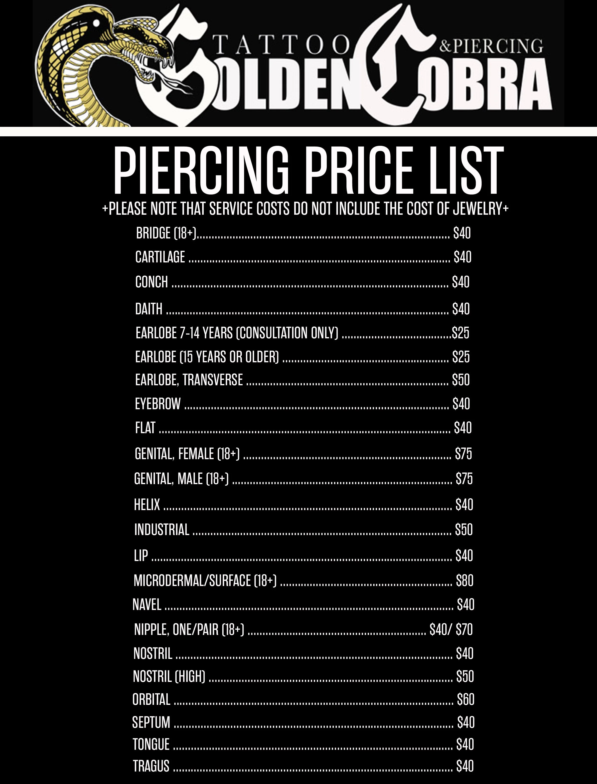 Services available to those 15-17 years of age include: Kush, Cartilage, Conch, Daith, Earlobe, Eyebrow, Flat, Helix, Industrial, Lip, Navel, Nostril, Rook, Septum, Tongue, TragusServices available to those 13-14 years of age include: Earlobe, Helix, Nostril